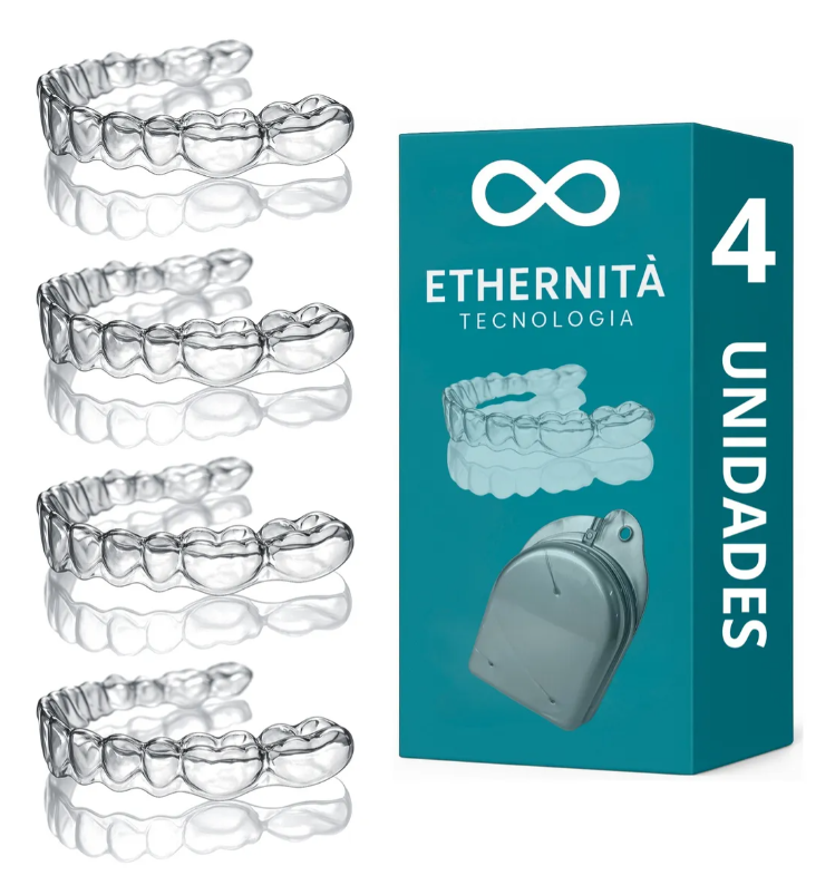 Desenvolvido para quem sofre com o desgaste dentário provocado pelo apertamento e ranger dos dentes (bruxismo), este kit traz 4 placas de silicone moldável — cada uma personalizável em sua própria boca — acompanhadas de um estojo prático e compacto para transporte ou armazenamento diário.