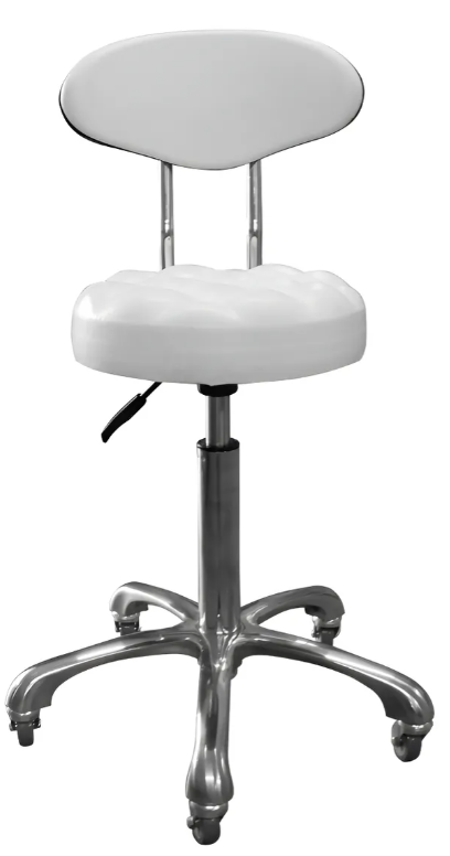 A estrutura é fabricada em Zamac, material altamente resistente e estável, suportando até 200 kg. Os rodízios com base de 53 cm de diâmetro permitem movimentação suave e segura. Disponível nas cores branco, combina elegância e funcionalidade para qualquer ambiente profissional.