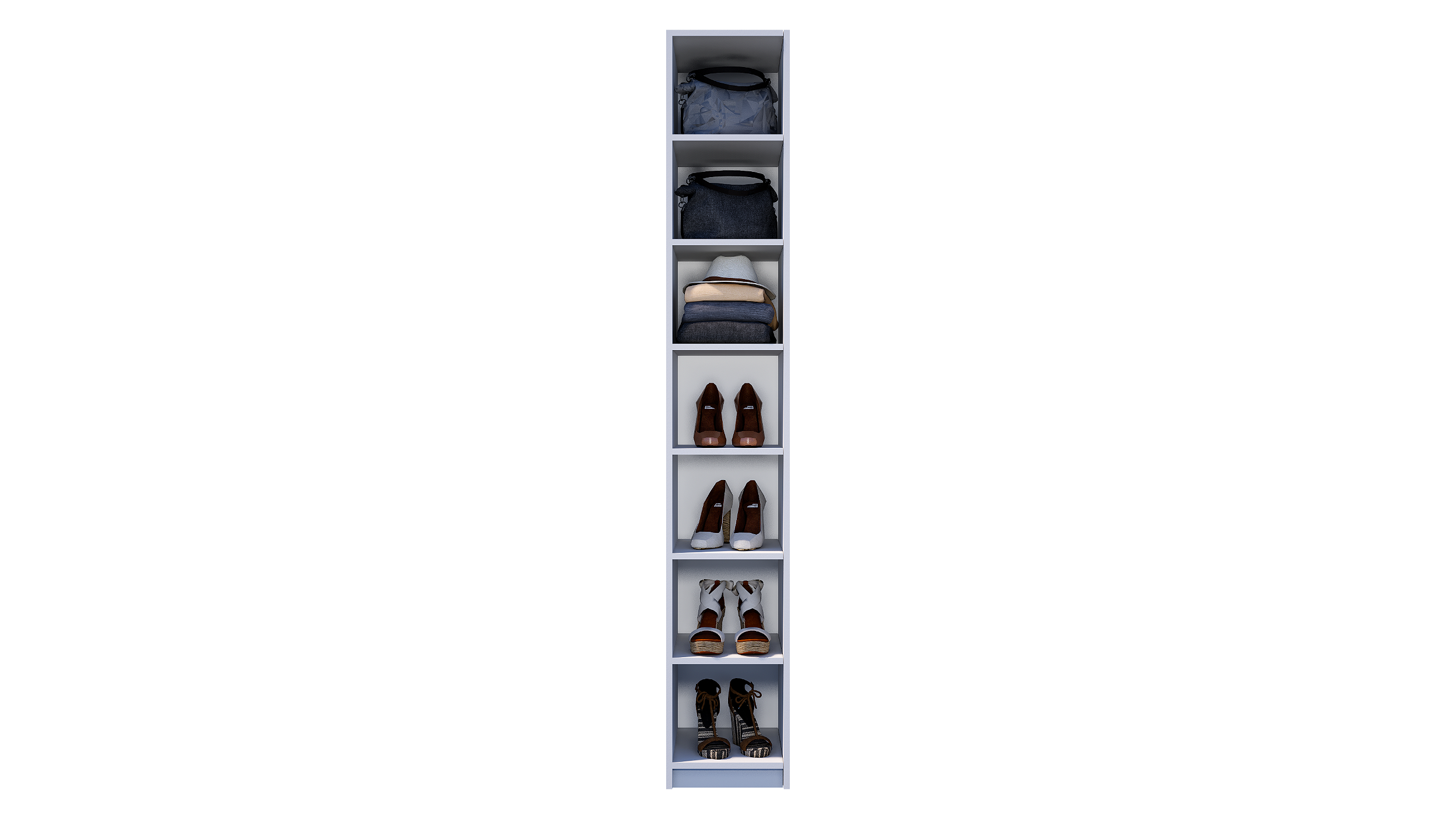 Com medidas de 1,85 m de altura, 30 cm de largura e 35 cm de profundidade, o modelo se adapta perfeitamente a closets, lojas, escritórios ou residências. Suas 7 prateleiras fixas oferecem amplo espaço para armazenar, organizar ou expor roupas, acessórios e produtos de forma prática e acessível.